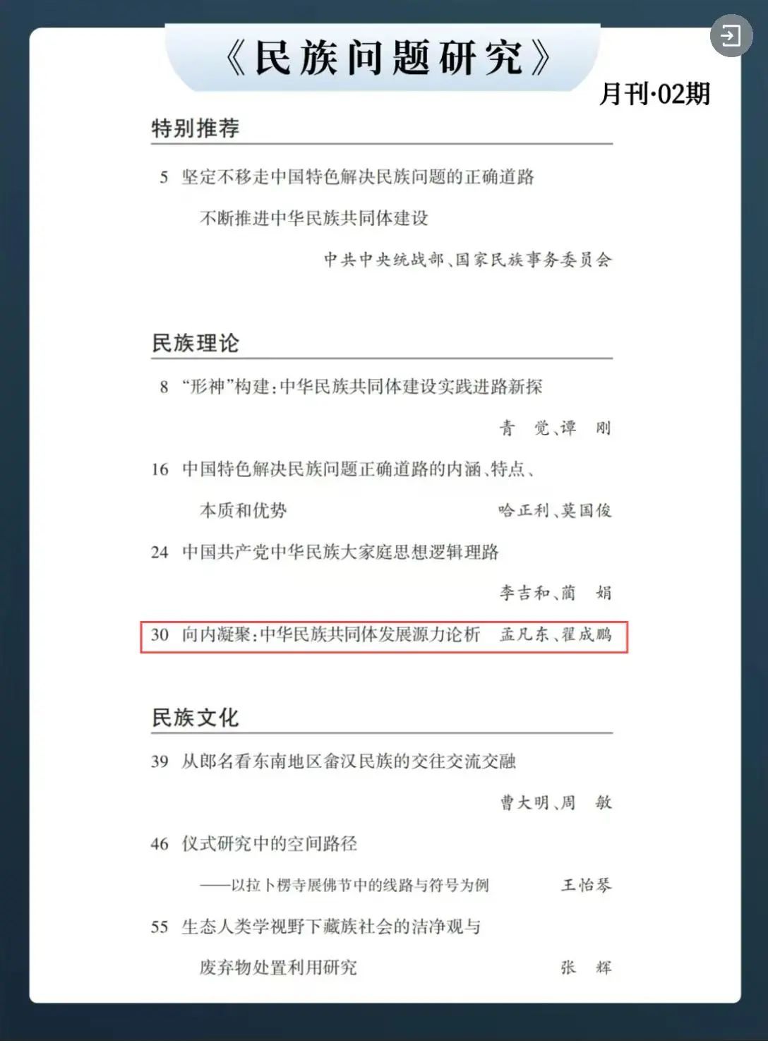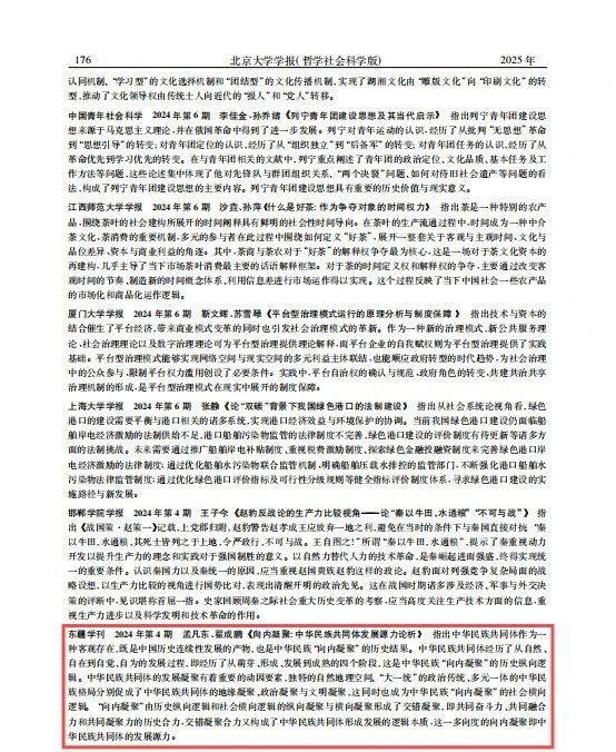 我院孟凡东教授与翟成鹏合作撰写的《向内凝聚:中华民族共同体发展源力论析》一文被《人大复印报刊资料·民族问题研究》2025年第2期全文转载,并被《北京大学学报(哲学社会科学版)》2025年第1期“全国高校文科学报概览”专栏摘编。该文首发于《东疆学刊》2024年第4期,指出中华民族共同体作为一种客观存在,既是中国历史连续性发展的产物,也是中华民族“向内凝聚”的历史结果。
