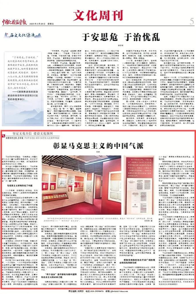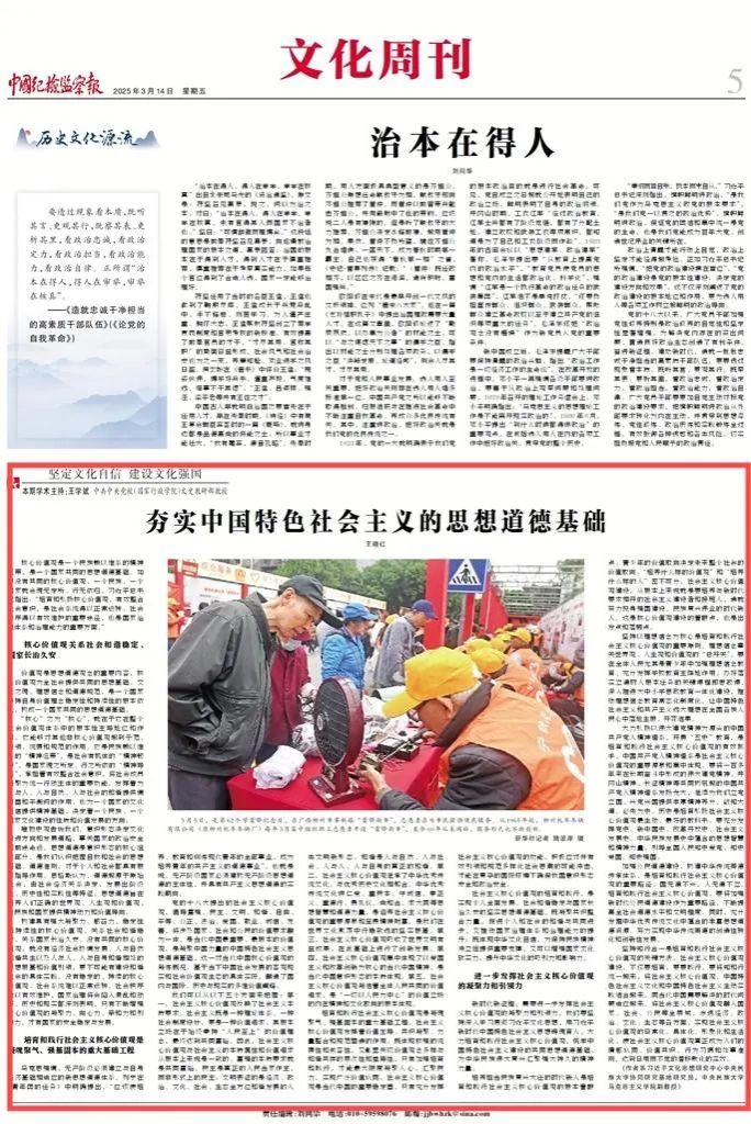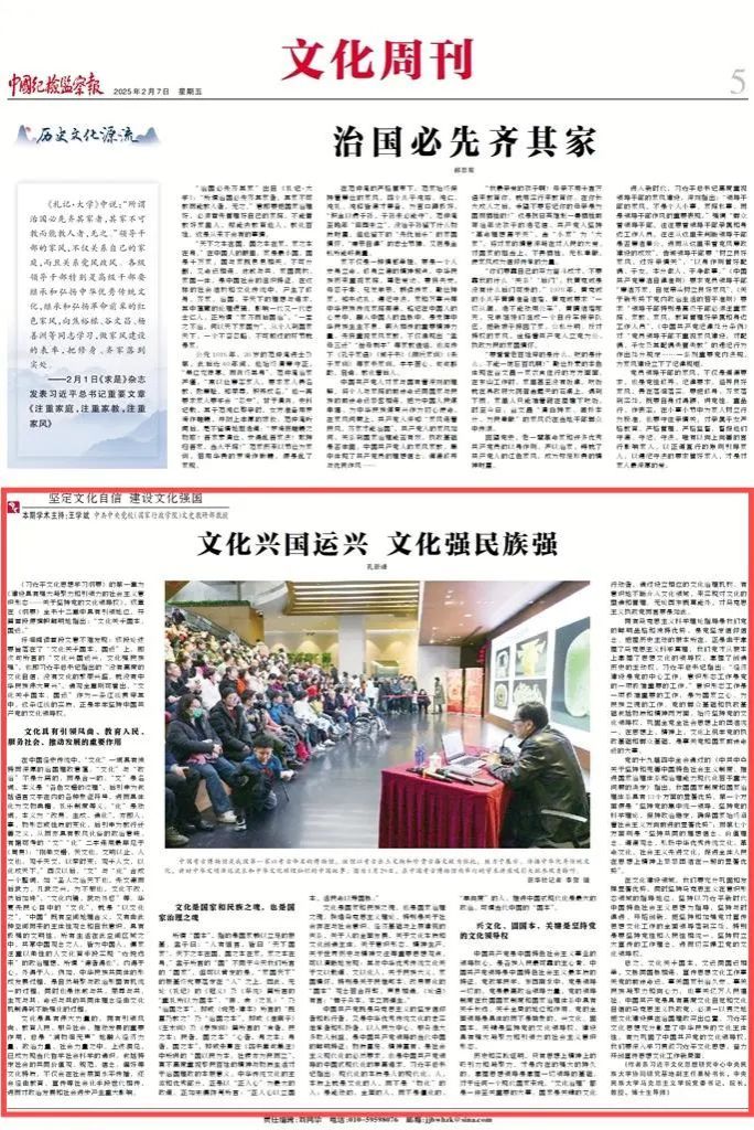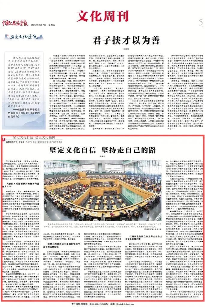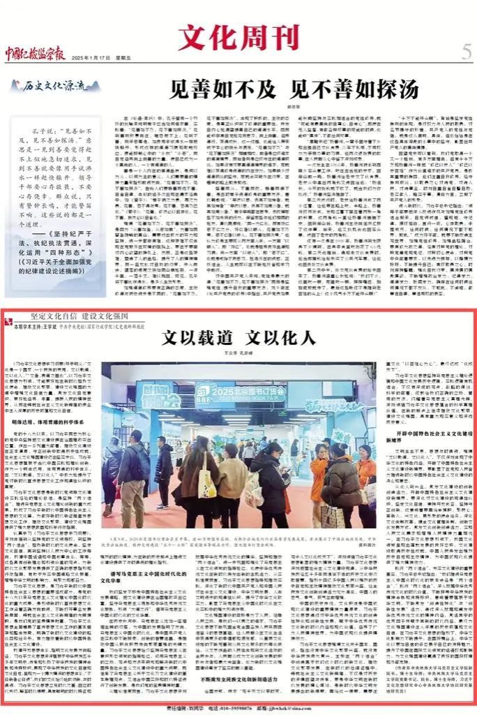 近日,我院教师围绕“坚定文化自信 建设文化强国”主题、深入解读《习近平文化思想学习纲要》,在《中国纪检监察报》发表了系列理论阐释文章,分别是王云芳教授、孔新峰教授《文以载道 文以化人》,孔新峰教授《文化兴国运兴 文化强民族强》,刘然副教授《彰显马克思主义的中国气派》,师英杰副教授《坚定文化自信 坚持走自己的路》,王晓红副教授《夯实中国特色社会主义的思想道德基础》。系列文章充分发挥我院为秘书处的习近平文化思想研究中心william威廉中文官网协同研究基地高端平台作用,以明白晓畅、即事明理的风格,助力形成习近平文化思想学理化体系化研究阐释的浓厚氛围,彰显了学院在党的创新理论研究与宣传中的先锋作用。