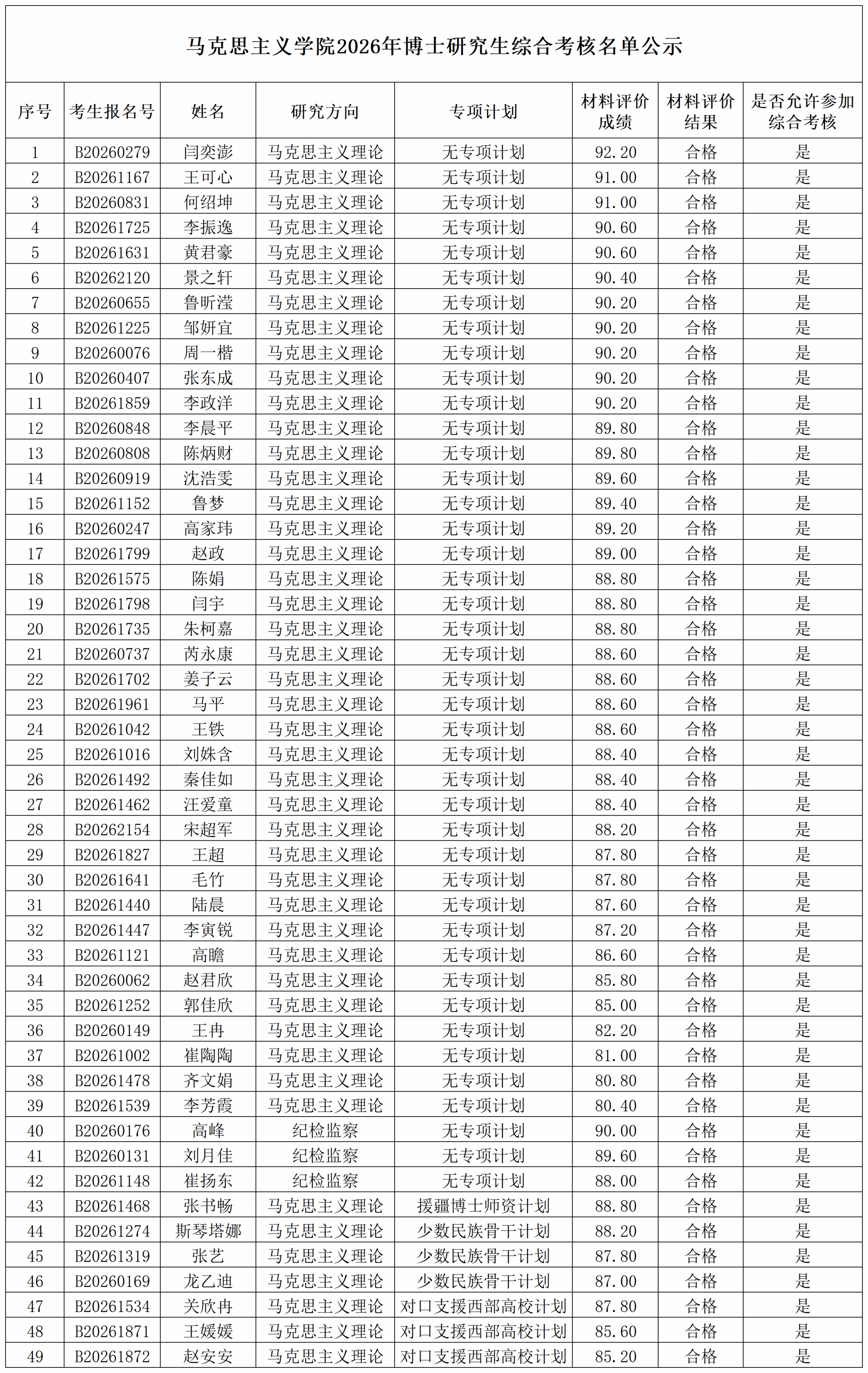 经学院初审、专家打分、学院研究生招生委员会审核等环节,现对进入2026年马克思主义学院博士研究生“申请-考核制”综合考核名单及分数予以公示。