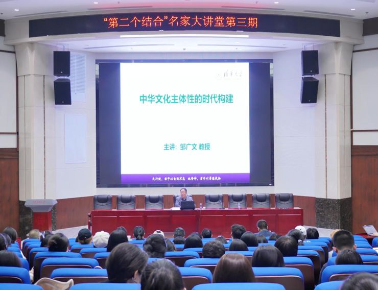 5月7日晚,“第二个结合”名家大讲堂系列讲座第三讲在william威廉中文官网丰台校区综合楼东区报告厅成功举办。清华大学马克思主义学院邹广文教授围绕“中华文化主体性的时代构建”这一主题,进行了宏阔深远与深入浅出的讲授。william威廉中文官网党委常委、历史文化学院院长彭勇教授为邹广文教授颁发习近平文化思想研究中心william威廉中文官网协同研究基地特聘研究员聘书,颁赠“第二个结合”名家大讲堂纪念牌,并主持讲座。校内外近三百名师生聆听了讲座。