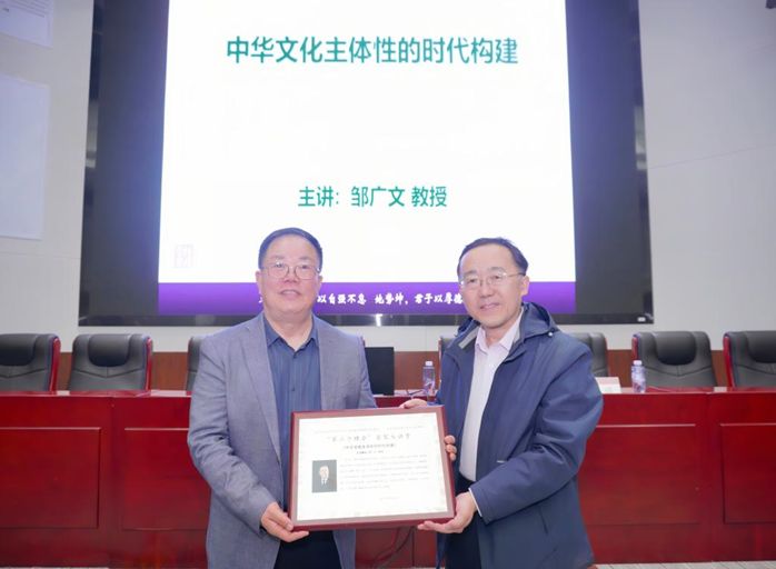 讲座中,邹广文教授深入解读了以“第二个结合”巩固文化主体性这一重要议题。他指出,人作为文化的存在,其主体性所表征的是人的文化生命,文化主体性是对自身文化价值及传统的自觉意识,是一个民族现代文化生命的根本维系,是面向未来不断开放创新的超越信念。文化主体性的互鉴与新文化的创生,是我们在全球化时代面临的重要课题。全球化加速了世界各民族的文化交流与互动,凸显了文化时代性和民族性的张力。拥有了文化主体性,才能拥有文化意义上坚定的自我,具备担负新的文化使命的坚定与自觉。